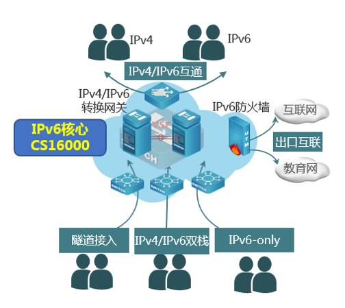 CS16000系列交换作为教育城域网的交换中心,承担各中心校网络、教育局局域办公网、数据中心的接入和转发,并通过安全出口区与市城域网等外网互通。